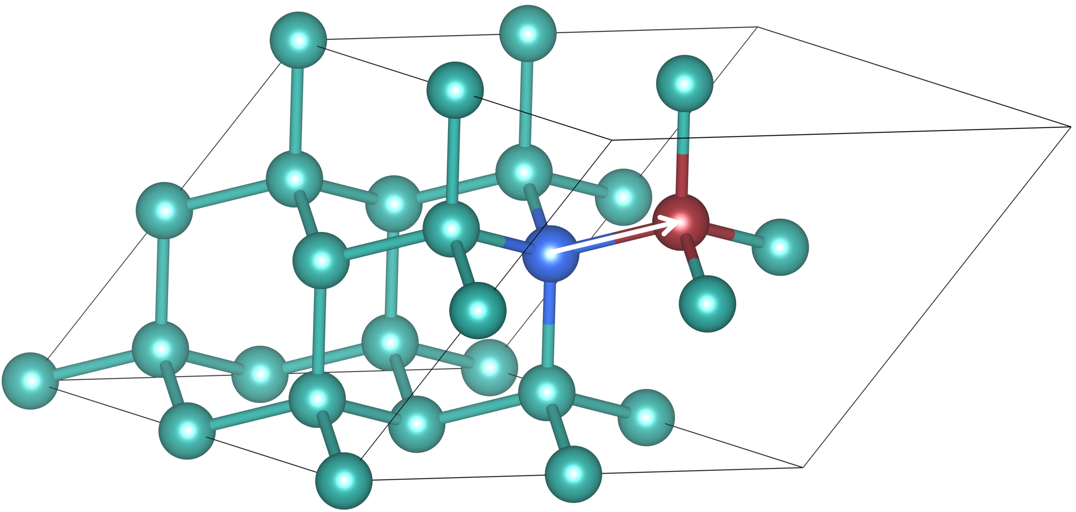 The Si atom in blue will move to the position of the red vacancy site during the NEB calculation, as shown by the arrow. The diffusion between sites in diamond cubic silicon is known as self-diffusion [Phys. Rev. B 59, 3969 (1999)] and is simple to model. In this exercise, we will investigate the reaction pathway associated with the self-diffusion. There is additional information on NEB and other transition state methods on the VASP Wiki.