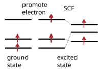 Perform a full SCF calculation with the above occupations to obtain the total energy of the system in its excited-state configuration, [math]\displaystyle{ E_{ex} }[/math]. Make sure that the correct excited state is preserved throughout the calculation.
