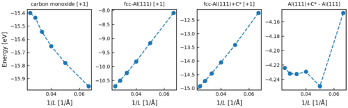 It is important to emphasize that the total energy cannot be corrected for charged slabs, since a charged slab results in an electrostatic potential that grows with the distance from the slab. This non-convergence of the potential is a result of the interaction between the charged slab and the compensating background. A practical consequence of this non-convergence is that the total energy depends linearly on the width of the vacuum. The Figure to the right shows the change in energy as a function of the inverse of the cell dimension for a molecule (carbon monoxide), a surface (fcc-All(111)) with and without the presence of surface adsorbates. In all these cases, the total energy does not converge as the cell dimension is increased.