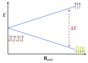 Fig 1. Energy E against the magnetic field B showing how the energy difference ΔE (red) between the spin up and down electrons changes with increasing magnetic field strength. This results in a slight difference in population between the up (purple) and down (green) states, the lower energy down state that is aligned with B being more populated according to the Boltzmann distribution.